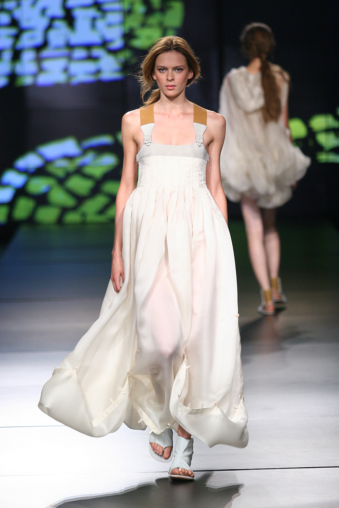 Cenário para o desfile da coleção de verão da Osklen no SPFW em 2008 com animações gráficas e vídeo-colagem editadas em tempo real.